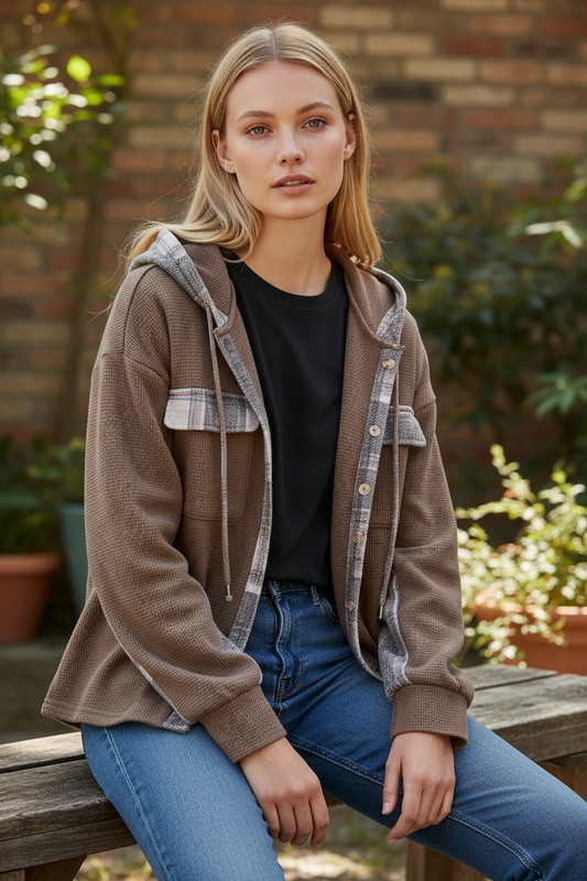 Plaid Patchwork Button-Up Drawstring Hooded Shacket